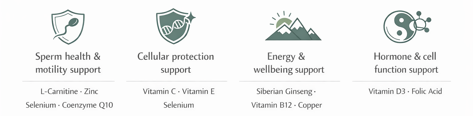 At the same time, less visible processes are being supported, including those linked to sperm health. This includes nutritional support for sperm quality, count, and motility — areas that naturally take longer to respond and can’t be felt in the same way as energy or mood.